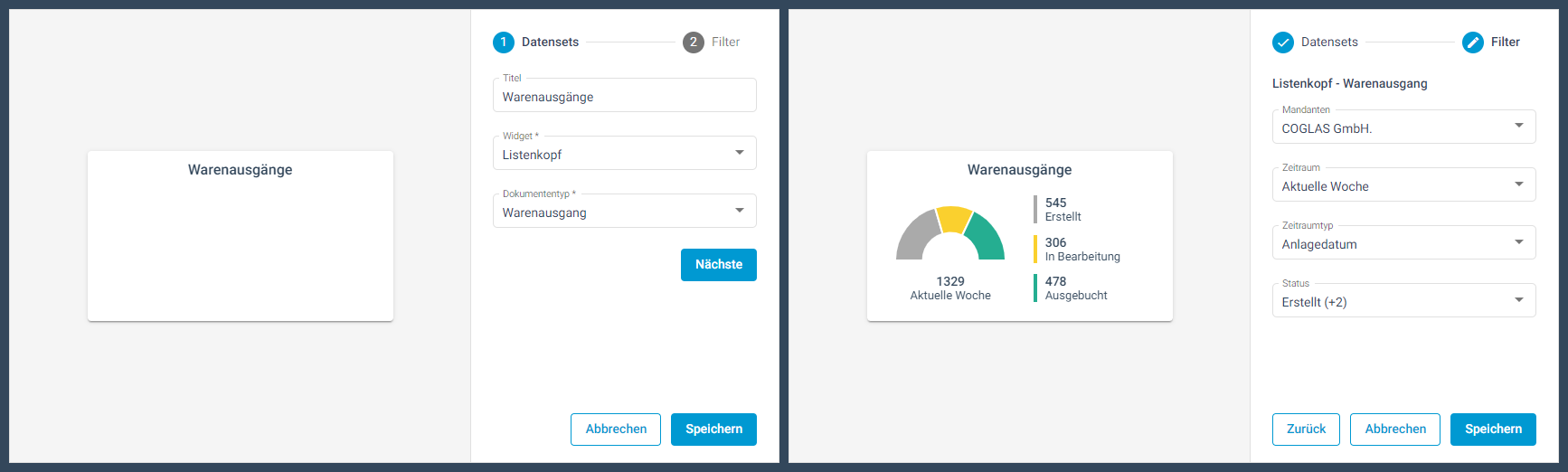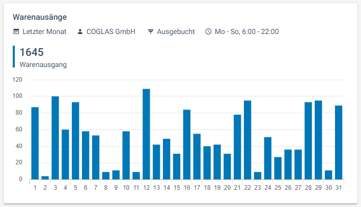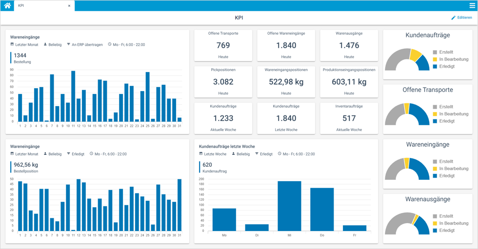 Mit den COGLAS KPI (Key Performance Indicators) lassen sich die Ergebnisse der Aktivitäten verschiedener Logistikprozesse darstellen. Zahlreiche Lagerkennzahlen lassen sich durch die Widgets (Anzeigetypen) Einzelwert, Multiwert und Säulendiagramm wiedergeben. Es besteht die Möglichkeit, Filter auszuwählen, wie zum Beispiel Mandant, Status oder Zeitintervall.