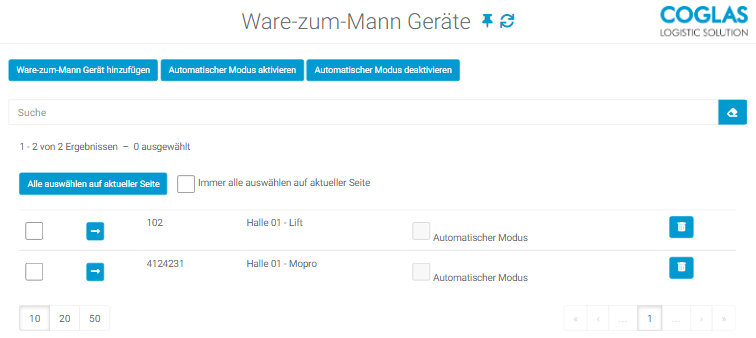 Shuttle bzw. Lifte lassen sich im COGLAS unter System -> Ware-zum-Mann-Geräte anlegen und konfigurieren. Zur Anlage von Geräten benötigen eine eindeutige Geräte Nr. sowie eine Topologieknoten aus der Lagerübersicht zur Verknüpfung.