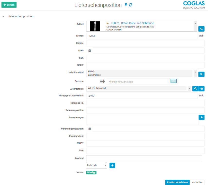 | Calling the delivery note position for editing, works only for positions in status not equal to Done. | |