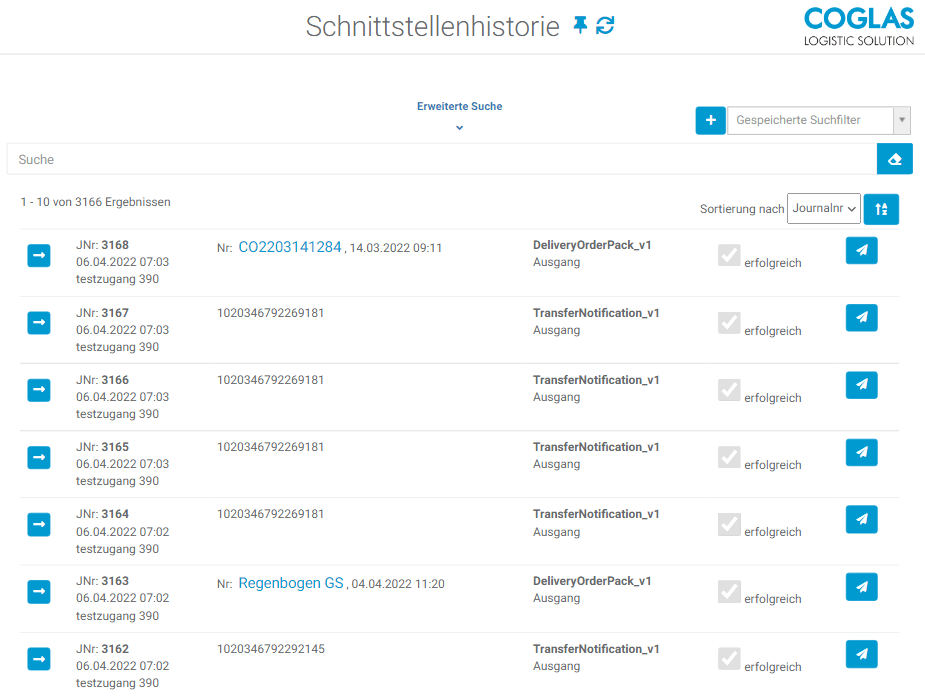The interface history logs the communication of the COGLAS Web WMS via COGLAS with message types linked systems.