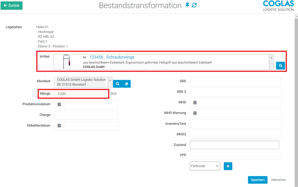 After that, the stock transformation can be performed. The article and the quantity can be adjusted.