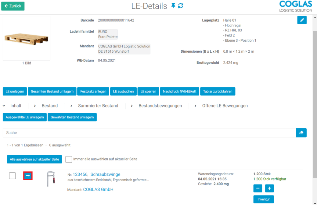 With the inventory transformation the user has the possibility to change all fields of the inventory details. The existing NVE/SSCC does not need to be changed in the process. Data such as article and quantity can be adjusted. The storage location cannot be changed. The inventory transformation differs in the option to customize the article and the quantity.