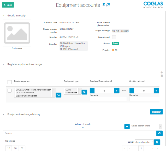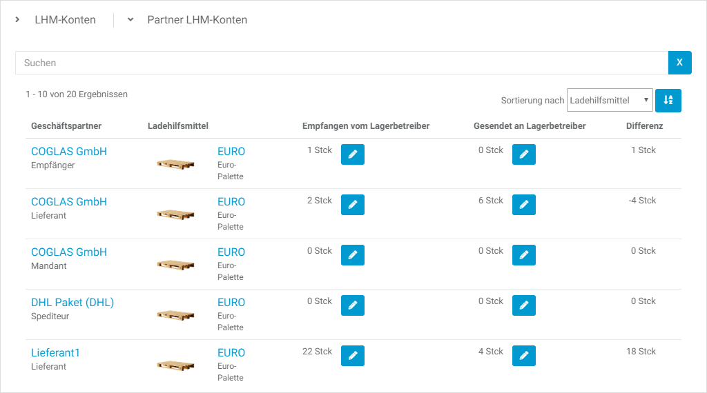 COGLAS offers you the possibility to manage your loading equipment (LHM). You have the option of posting all receipts and issues of all loading equipment on a business partner-specific basis and tracking them historically.