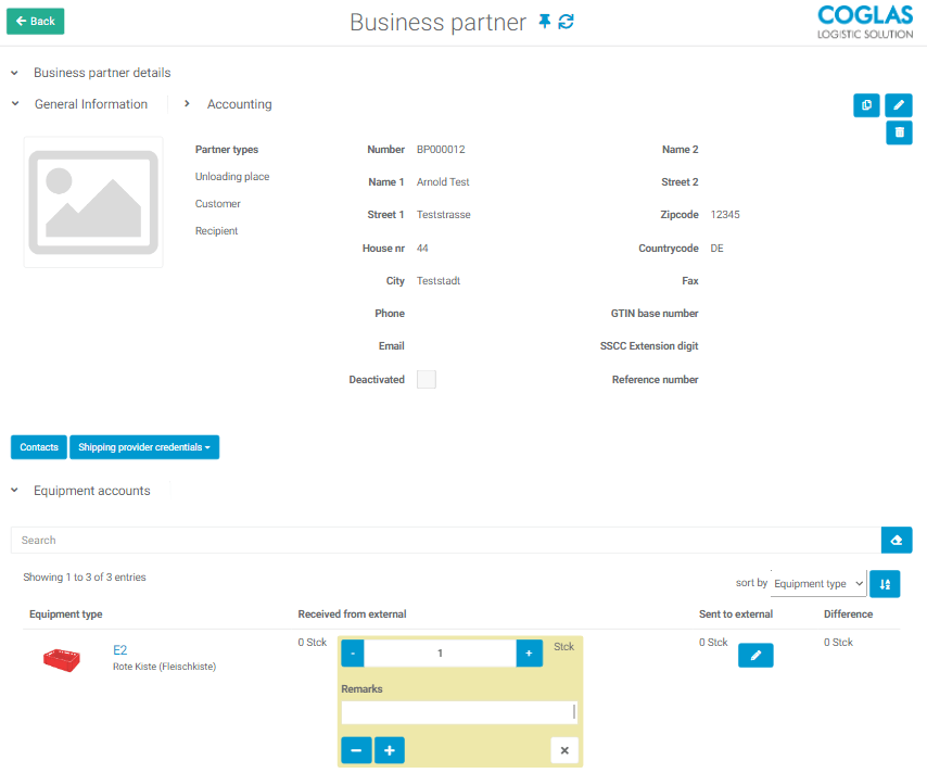 The equipment account is always managed from the point of view of the warehouse owner. There can be only one warehouse owner in the system. In the overview at the business partner you can see the summarized equipment account and the equipment account of each business partner.